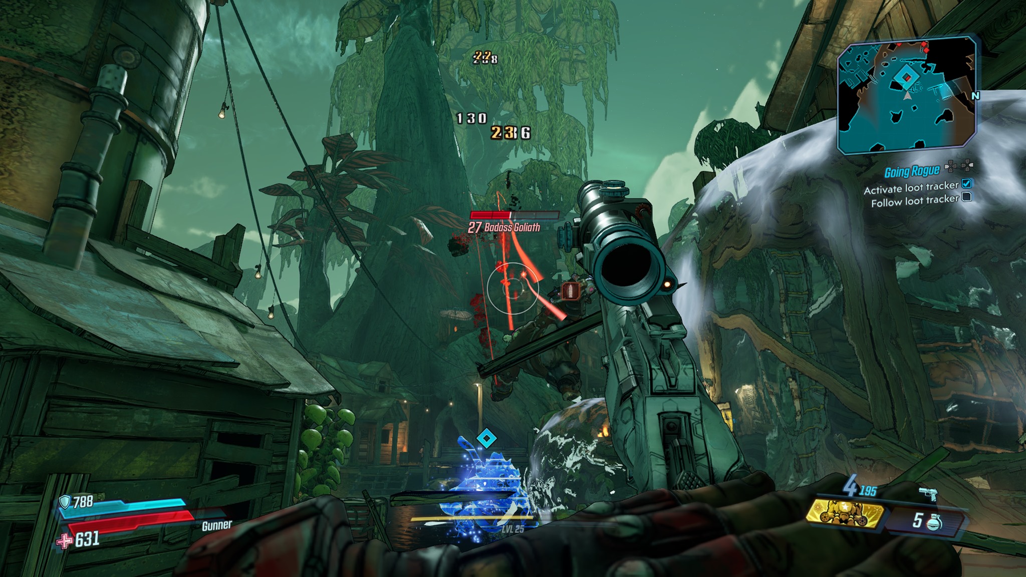 This particular blaster fires four different bullets at once and melts armour better than xenomorph blood. It’s a Tediore weapon so I reload it by tossing it away as a new one materialises into my hands, the discarded gun acting like a grenade. Some Tediore firearms sprout legs and run around on killing sprees. Others turn into drones when reloaded. Mine? It’s like a miniature nuke.